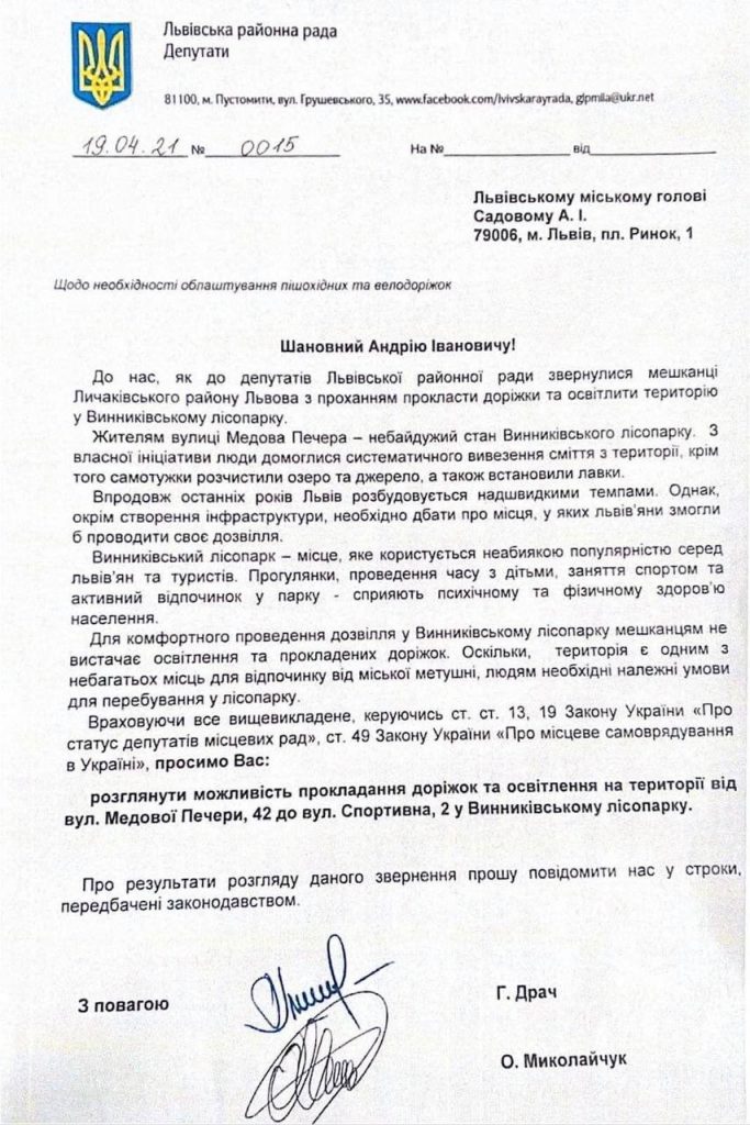 “Просимо розглянути можливість прокладання та освітленння на території від вул. Медової Печери, 42 до вул. Спортивна, 2 у Винниківському лісопарку”, – йдеться у зверненні до міського голови Львова Андрія Садового.
