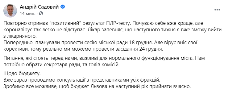 Повторно отримав “позитивний” результат ПЛР-тесту. Почуваю себе вже краще, але коронавірус так легко не відступає. Лікар запевняє, що наступного тижня я вже зможу вийти з лікарняного. Попередньо планували провести сесію міської ради 18 грудня. Але вірус вніс свої корективи, тому реально ми можемо провести засідання 24 грудня.