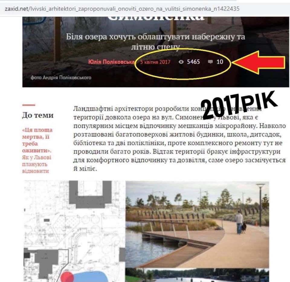 Другий «камінь» – це озеро, яке також потребує інвестицій. Садовий приїхав не з порожніми руками – він привіз… презентацію! Мер довго розповідав, як тут все буде добре, як поміняють лавки та ліхтарі і навіть показав, як все буде виглядати. Картинка, звісно ж, красива, але вона, м’яко кажучи, не нова. Із презенацією, до якої входили ідентичні зображення, він вже виступав у далекому 2017-му році. Тоді, до речі, він також обіцяв, що «от-от розпочнуться ремонтні роботи», покликані на облаштування благоустрою території. Про це двічі (і тоді, і зараз) не написав сайт «Захід.нет», який належить дружині Андрія Садового.