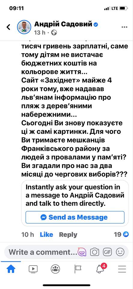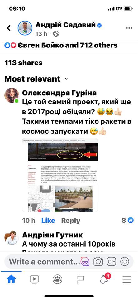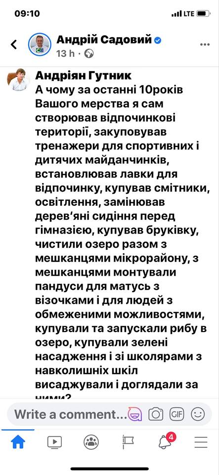 «Тобто, вийшло так: Садовий нічим не допомагав протягом років, а тут, за два місяці до виборів, він з’явився і розповів, яке «чудо» він тут зробить. Найцікавіше, що він показав презентацію, як воно має виглядати у результаті, але вона не є новою. Ті самі картинки Андрій Садовий перезентував у 2017-му році і ще тоді казав, що «скоро розпочнуться роботи по благоустрою», а тепер він знову прийшов із ними. Він це запостив на свою сторінку і я йому поставив питання у коментарях, чому досі він цим не займався і чому ми спільно з громадою мали все робити за власні гроші. Він проігнорував моє питанняі ба більше, зовсім приховав їх, щоб їх не бачили інші люди», – підсумував Андріян Гутник.