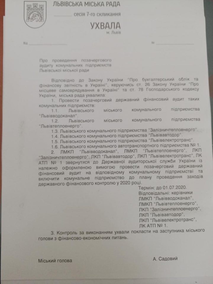 Депутати вимагають перевірити діяльність “Львівводоканалу”, “Львівтеплоенерго”, “Залізничтеплоенерго”, “Львівавтодору”, “Львівелектротрансу” та АТП №1.