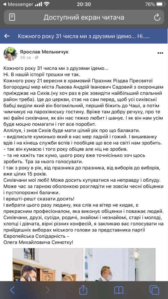 “Кожного року 21 вересня в храмовий празник Різдва Пресвятої Богородиці мер міста Львова Андрій Іванович Садовий з охоронцем приїжджає на Сихів. Ну хоч раз в рік побачити найбільший спальний район треба. Іде до церкви, стає на сам перед, щоб усі сихівські бабці бачили, який він богомільний… Перший біжить до чаші, а потім “чимчикує” на парохіянську гостину. Вріже там добру рєчуху, про те які файні сихівчани, як він нас тяжко любить і шанує. І як він нам усім буде міцно помагати і геть все поробить…”, – йдеться у дописі.