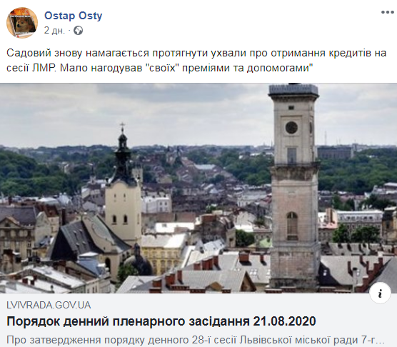 “Мало нагодував “своїх” преміями та допомогами”. Що скажуть на це депутати? Громада міста має дати оцінку діям Садового, який узурпував владу у Львові і відправити його на смітник історії“,- пише Ostap Osty.