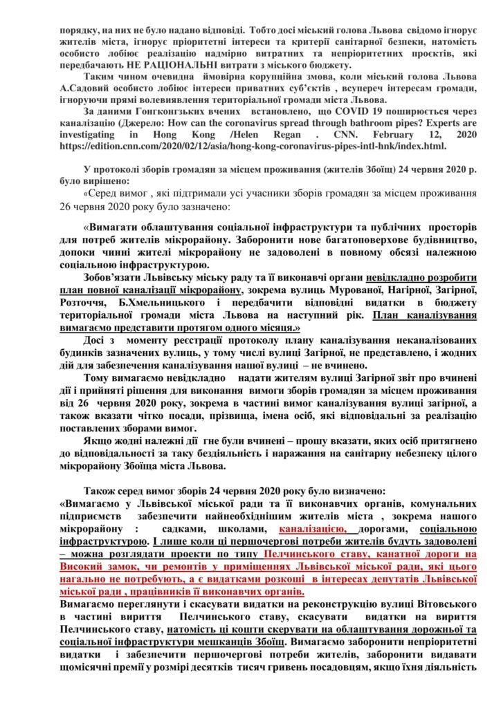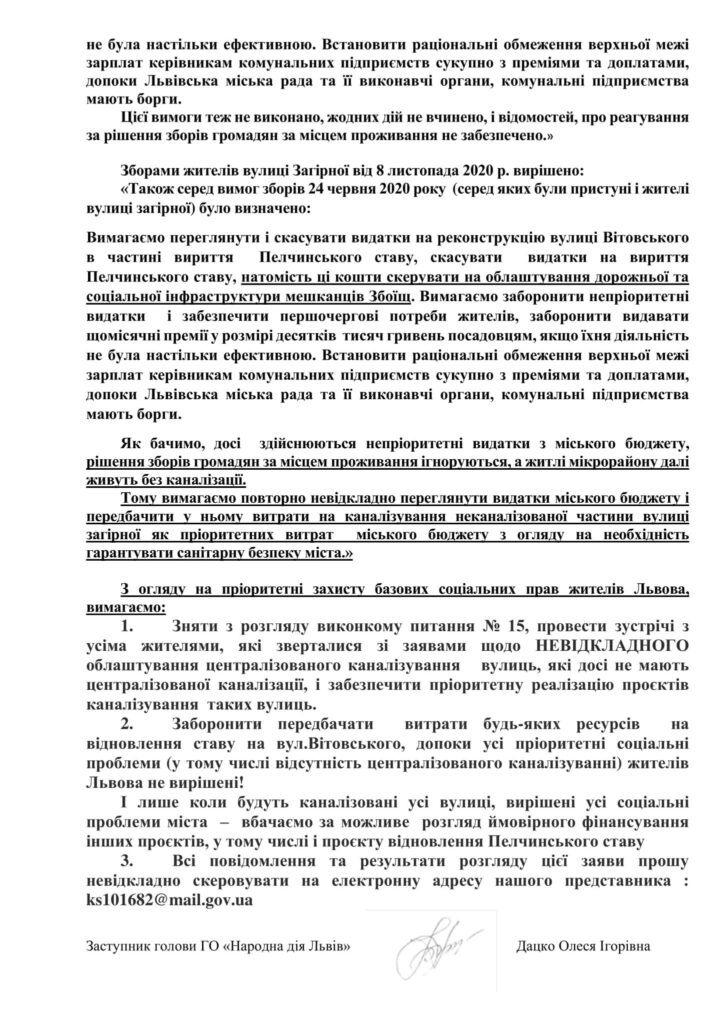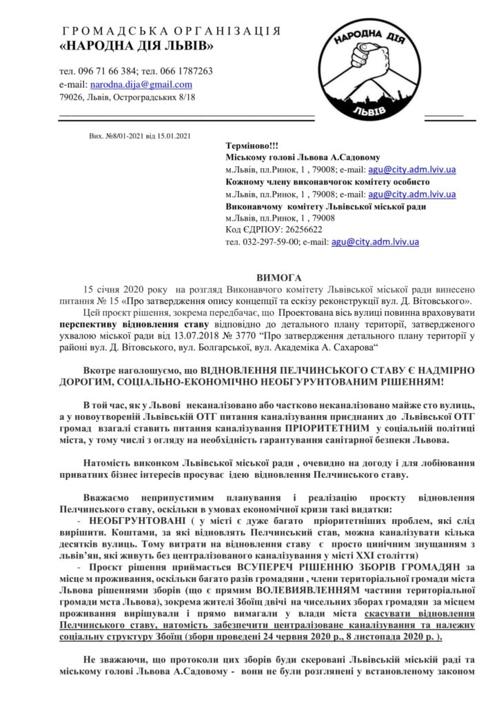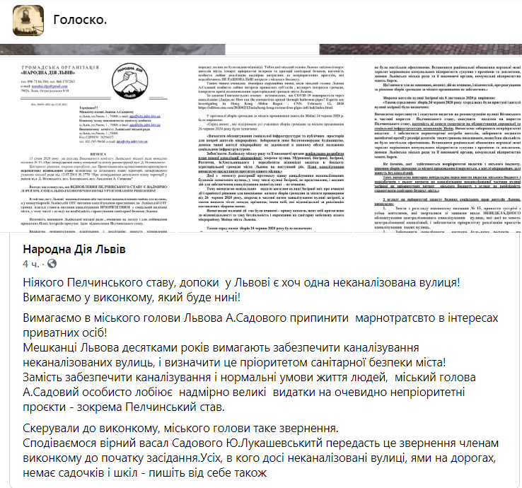 Як зазначається у дописі на сторінці спільноти “Народна Дія Львів” у ФБ, “ніякого Пелчинського ставу, допоки у Львові є хоч одна неканалізована вулиця! Вимагаємо у виконкому, який буде нині! Вимагаємо в міського голови Львова А.Садового припинити марнотратсвто в інтересах приватних осіб! Мешканці Львова десятками років вимагають забезпечити каналізування неканалізованих вулиць, і визначити це пріоритетом санітарної безпеки міста! Замість забезпечити каналізування і нормальні умови життя людей, міський голова А.Садовий особисто лобіює надмірно великі видатки на очевидно непріоритетні проєкти – зокрема Пелчинський став. Скерували до виконкому, міського голови таке звернення. Сподіваємося вірний васал Садового Ю.Лукашевськитй передасть це звернення членам виконкому до початку засідання.Усіх, в кого досі неканалізовані вулиці, ями на дорогах, немає садочків і шкіл – пишіть від себе також”.