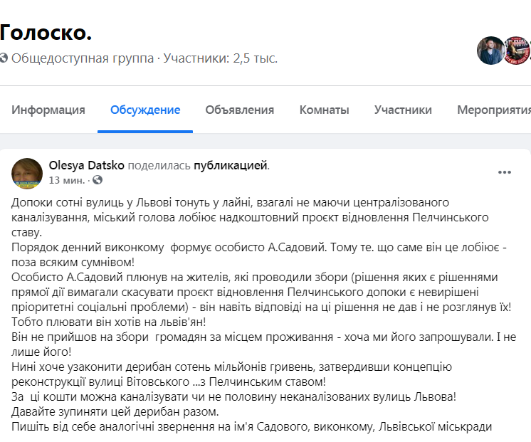 Автор допису пише, що «особисто А.Садовий плюнув на жителів, які проводили збори (рішення яких є рішеннями прямої дії вимагали скасувати проєкт відновлення Пелчинського допоки є невирішені пріоритетні соціальні проблеми) – він навіть відповіді на ці рішення не дав і не розглянув їх! Тобто плювати він хотів на львів’ян! Він не прийшов на збори громадян за місцем проживання – хоча ми його запрошували. І не лише його!».
