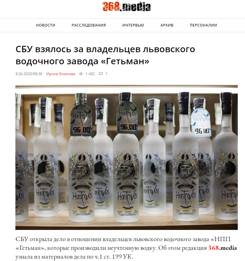 СБУ відкрила справу стосовно власників львівського горілчаного заводу «НВП «Гетьман», які виробляли необліковану горілку. Про це редакція 368.media дізналася з матеріалів справи за ч.1 ст. 199 КК.