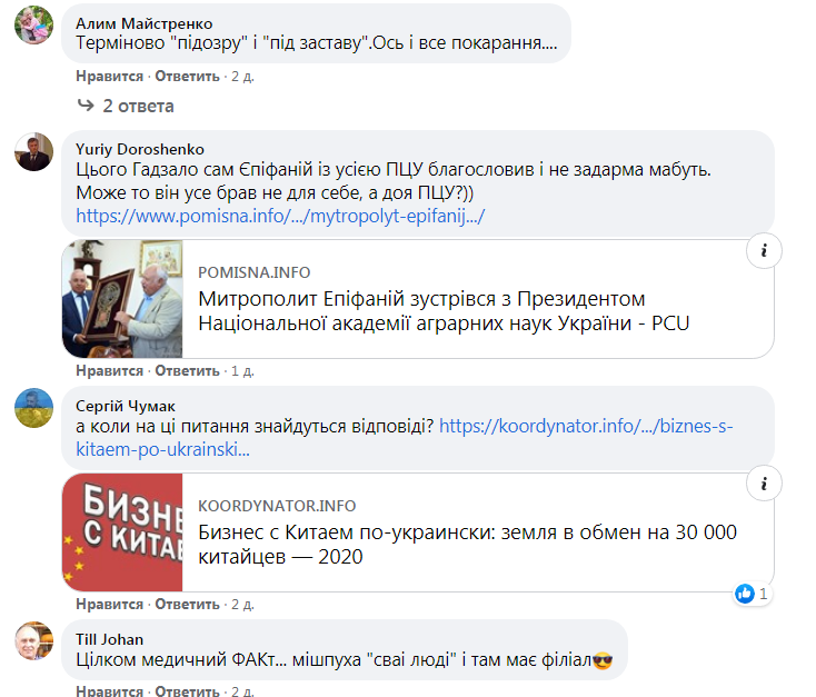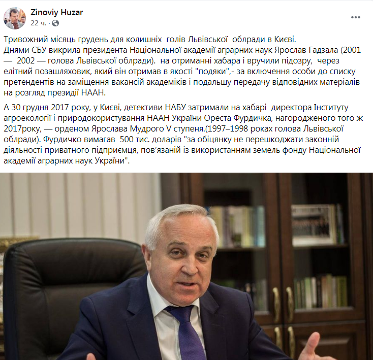 У дописі на своїй сторінці у ФБ Zinoviy Huzar пише, що СБУ викрила президента Національної академії аграрних наук Ярослава Гадзала (2001 — 2002 — голова Львівської облради).