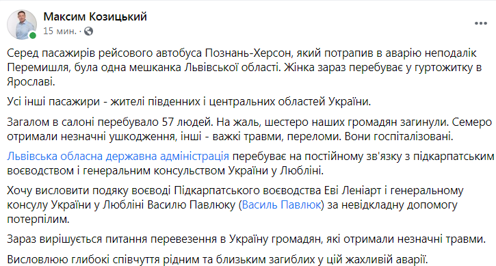 “Загалом в салоні перебувало 57 людей. На жаль, шестеро наших громадян загинули. Семеро отримали незначні ушкодження, інші – важкі травми, переломи. Вони госпіталізовані. Львівська обласна державна адміністрація перебуває на постійному зв’язку з підкарпатським воєводством і генеральним консульством України у Любліні. Хочу висловити подяку воєводі Підкарпатського воєводства Еві Леніарт і генеральному консулу України у Любліні Василю Павлюку за невідкладну допомогу потерпілим. Зараз вирішується питання перевезення в Україну громадян, які отримали незначні травми. Висловлюю глибокі співчуття рідним та близьким загиблих у цій жахливій аварії”,- зазначає Козицький.