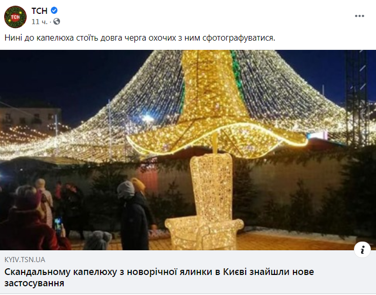 “Довжелезна черга стоїть до накращого символічного місця, де можна загадати бажання під чарівним капелюхом. Символічне фото під найочікуванішим арт-об’єктом сезону можна зробити біля головної ялинки країни. Дякую вам, дорогі Ігор Добруцький, Надія Тутенко та Folk Ukraine за казку! За натхнення, за любов до прекрасного і за віру в людей попри все”, – написала у Facebook керівниця департаменту культури КМДА Діана Попова.