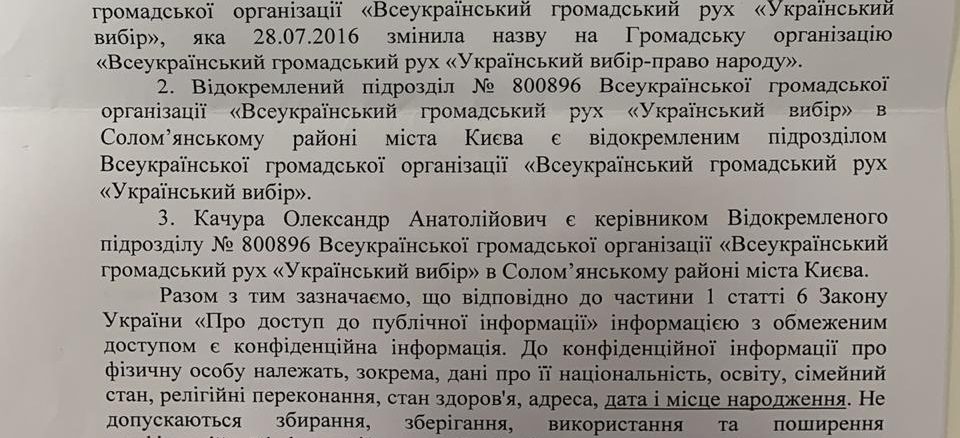 Народний депутат із фракції «Слуга народу» Олександр Качура є керівником відокремленого підрозділу ВГО «Всеукраїнський громадський рух «Український вибір» у Солом’янському районі Києва. Про це йдеться у листі Центрального міжрегіонального управління Міністерства юстиції (м.Київ), отриманому у відповідь на запит представника «Європейської Солідарності», пише “Четверта студія”.