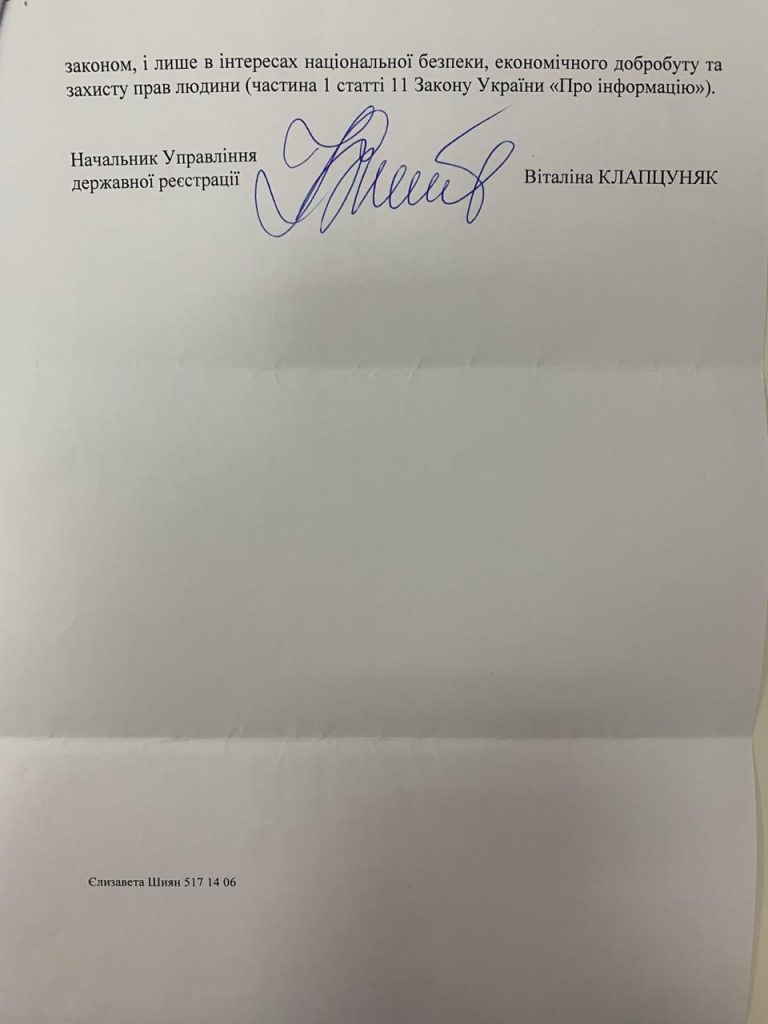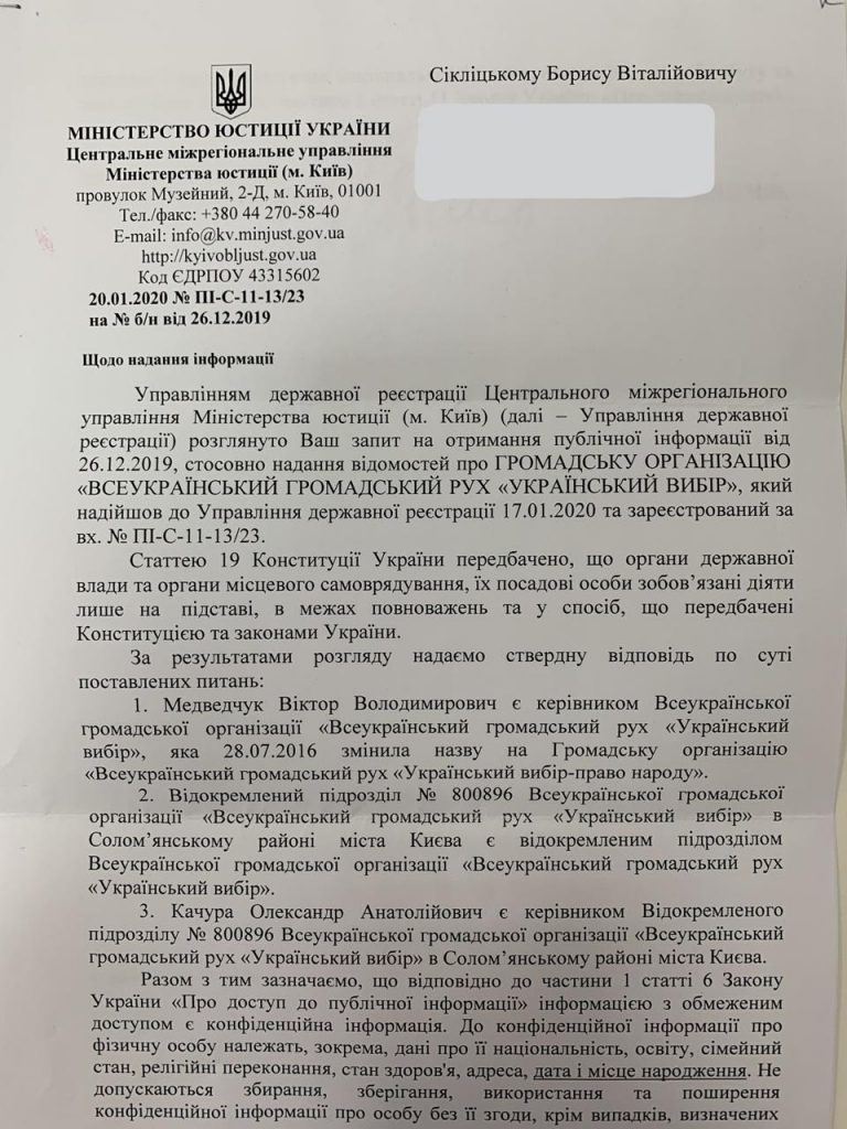 У цьому ж листі Мін’юст підтверджує, що керівником ВГО «Український вибір» є нардеп «Опозиційної платформи – За життя» Віктор Медведчук.
