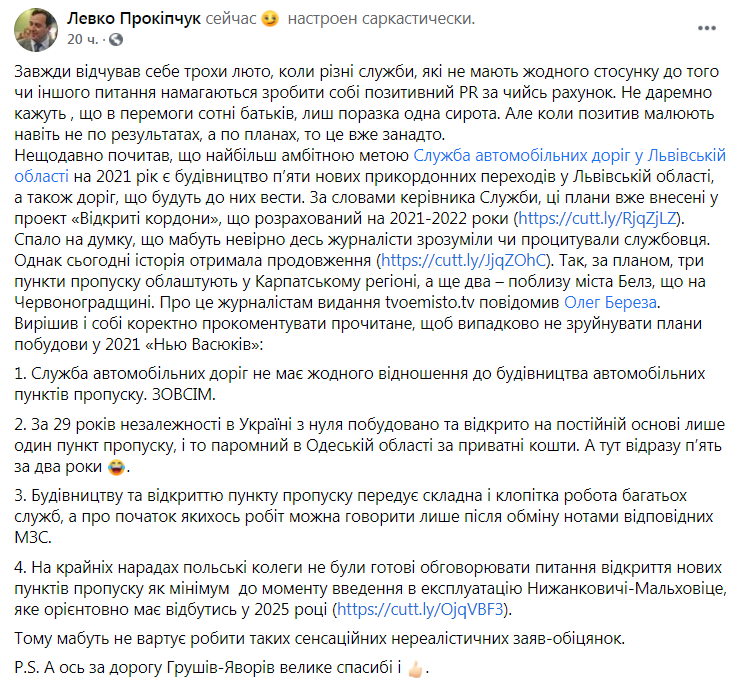 «Вирішив і собі коректно прокоментувати прочитане, щоб випадково не зруйнувати плани побудови у 2021 «Нью Васюків»»,- зазначив у дописі на своїй сторінці у ФБ Левко Прокіпчук.