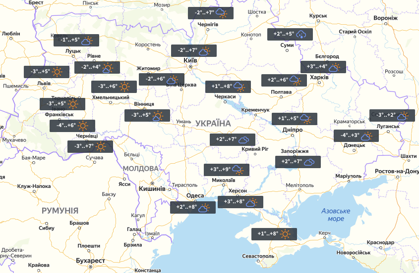 У четвер, 26 листопада, практично по всій території країни – малохмарна і сонячна погода. Дощ пройде тільки в Сумській області. Стовпчики термометрів протягом дня піднімуться до +4°…+9°. Вночі найхолодніше буде в Івано -Франківську – тут стовпчики термометрів опустяться до -4°.
