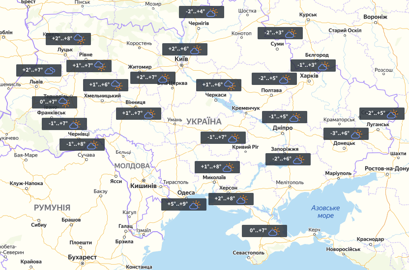 У Харкові хмарно з проясненнями, температура вночі -1°, вдень +3°.