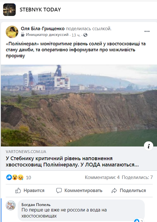Після цього об’єм виробництва калійних мінеральних добрив у Стебнику зменшився, проте ймовірність прориву дамби хвостосховища зберігається, оскільки в дамбі наявні дрібні тріщини, але належних запобіжних заходів не було вжито