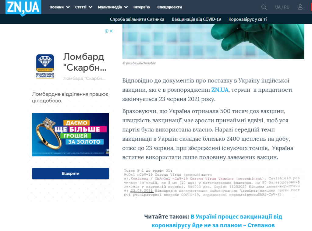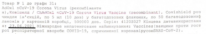 Відповідно до документів про поставку в Україну індійської вакцини, які є в розпорядженні ZN.UA, термін її придатності закінчується 23 червня 2021 року.