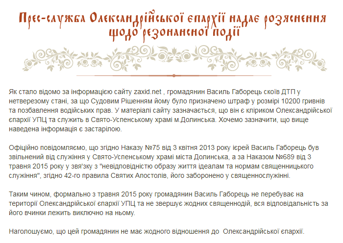 За інформацією з офіційного сайту Олександрійської єпархії УПЦ (МП), отець Василь Габорець служить у Свято-Успенській церкві у місті Долинська Кіровоградської області.