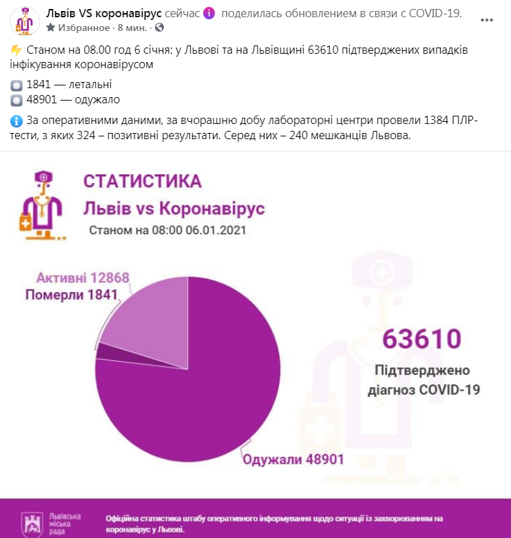 У Львівській області, станом на 08.00 год 6 січня, 63610 підтверджених випадків інфікування коронавірусом, 1841 — летальні, 48901 — одужало.