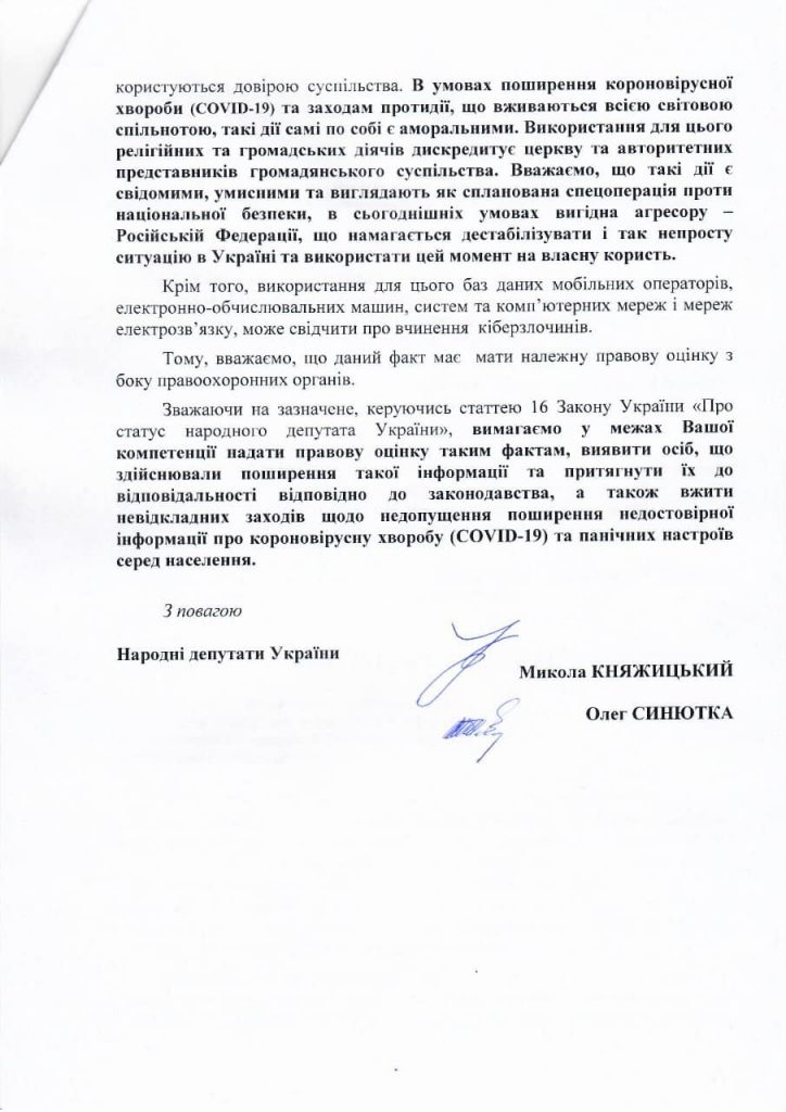 Олег Синютка повідомив, що депутати звернулись до правоохоронних органів та Ради нацбезпеки розібратися із масовою розсилкою провокаційних неправдивих повідомлення на телефони громадян.