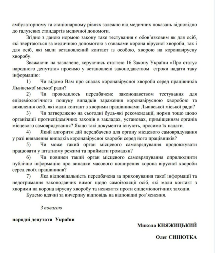 За словами Синютки, він з нардепом від “ЄС” Миколою Княжицьким, підготували депутатські звернення до міністра охорони здоров’я України Максима Степанова та до голови ЛОДА Максима Козицького, через спалах коронавірусу в стінах Львівської міської ради.