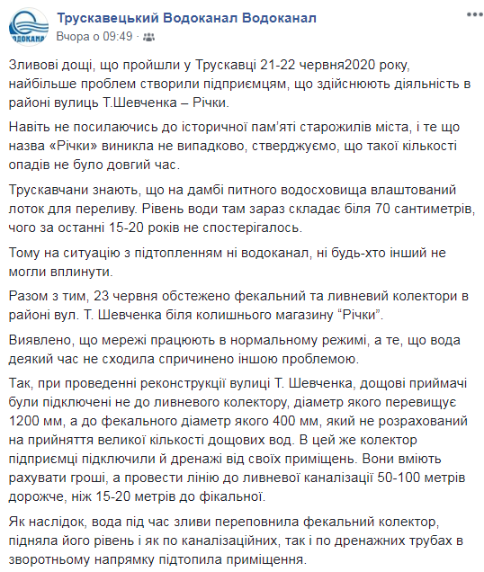 Як пишуть «Джерела Трускавця», «міський водоканал Трускавця видав сумбурний текст, у якому пояснює причини паводків на центральних вулицях курорту Шевченка-Річки під час дощів».