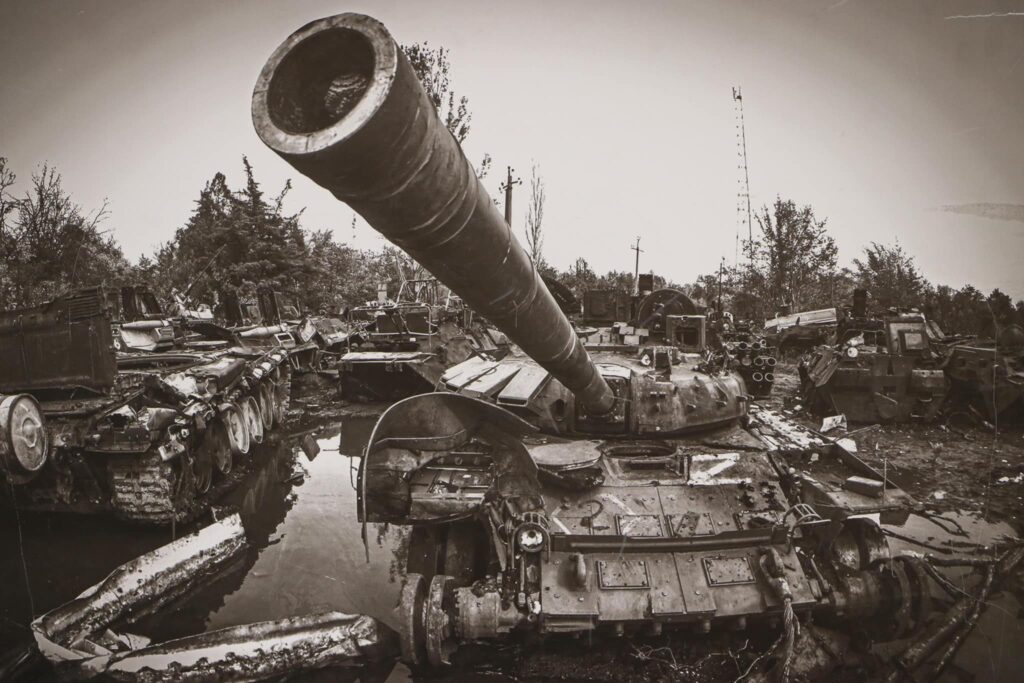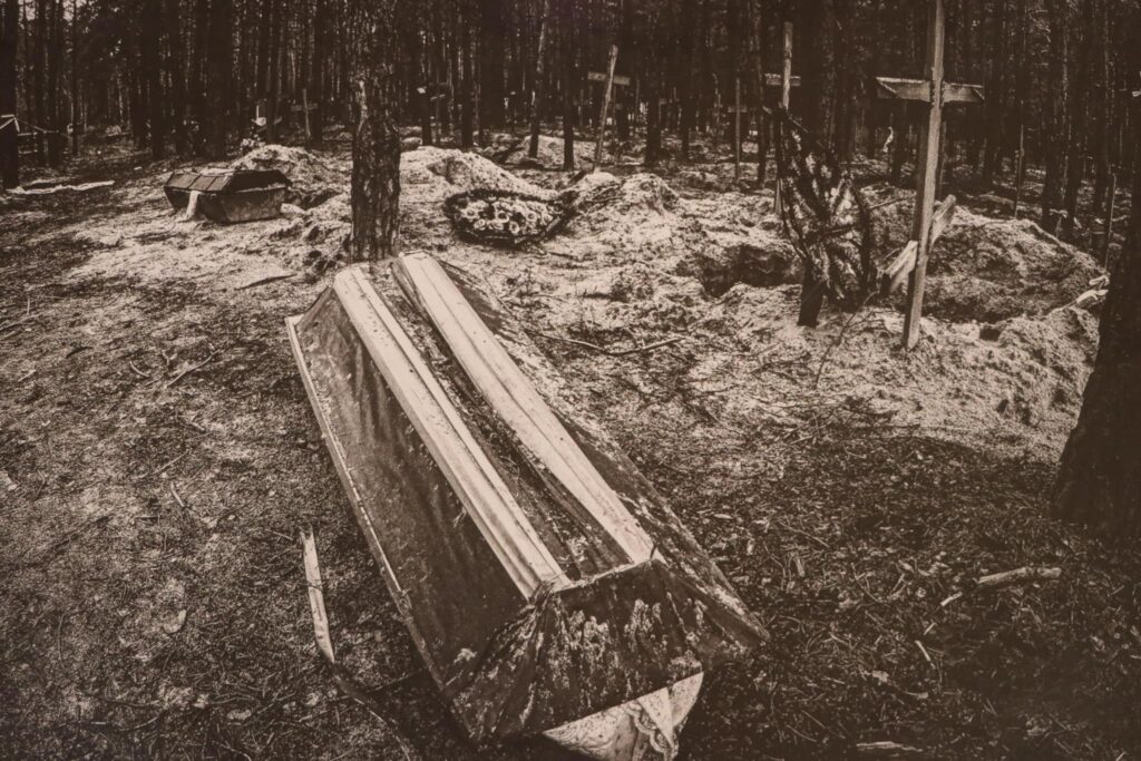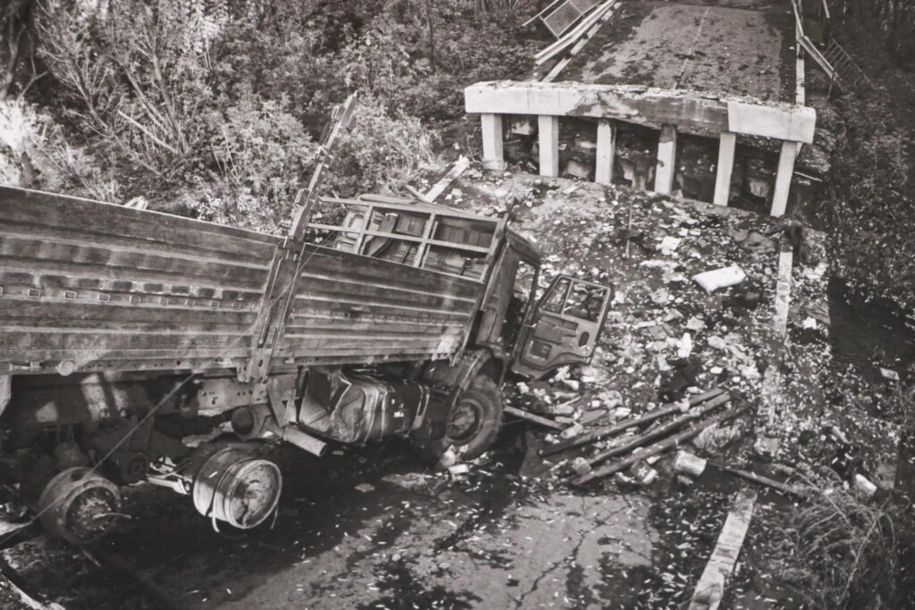 У роботах з Ізюма можна побачити масові поховання у лісах, знищену російську техніку, зруйнований міст, дітей у власних будинках, пошкоджених через обстріли. На знімках з Бахмута – українські прапори на обстріляних стінах, зруйновані багатоповерхівки, пара пенсіонерів з валізою, закривавлені ноші, на яких лежали наші військові.