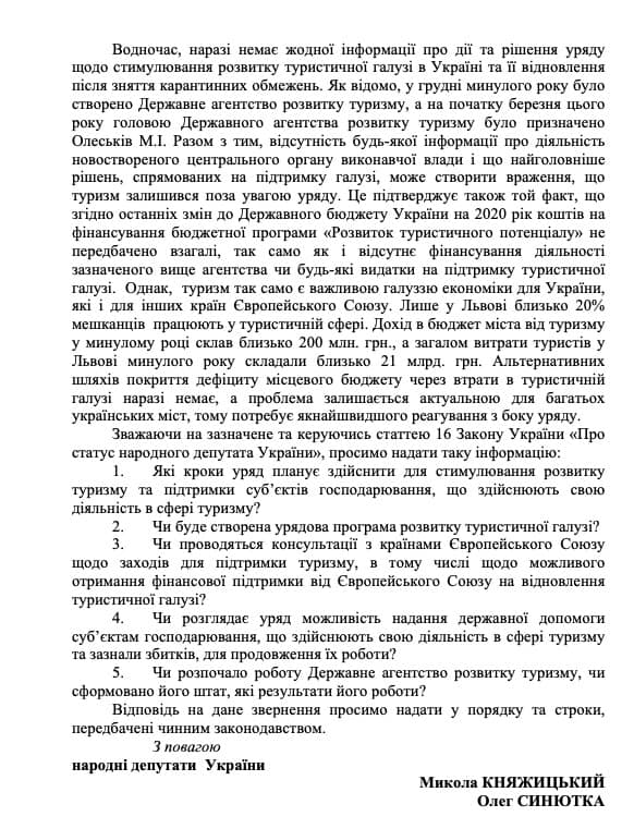 Народний депутат від “Європейської солідарності” Олег Синютка надіслав депутатське звернення до уряду щодо розвитку туризму після пандемії.