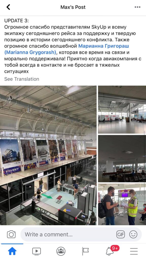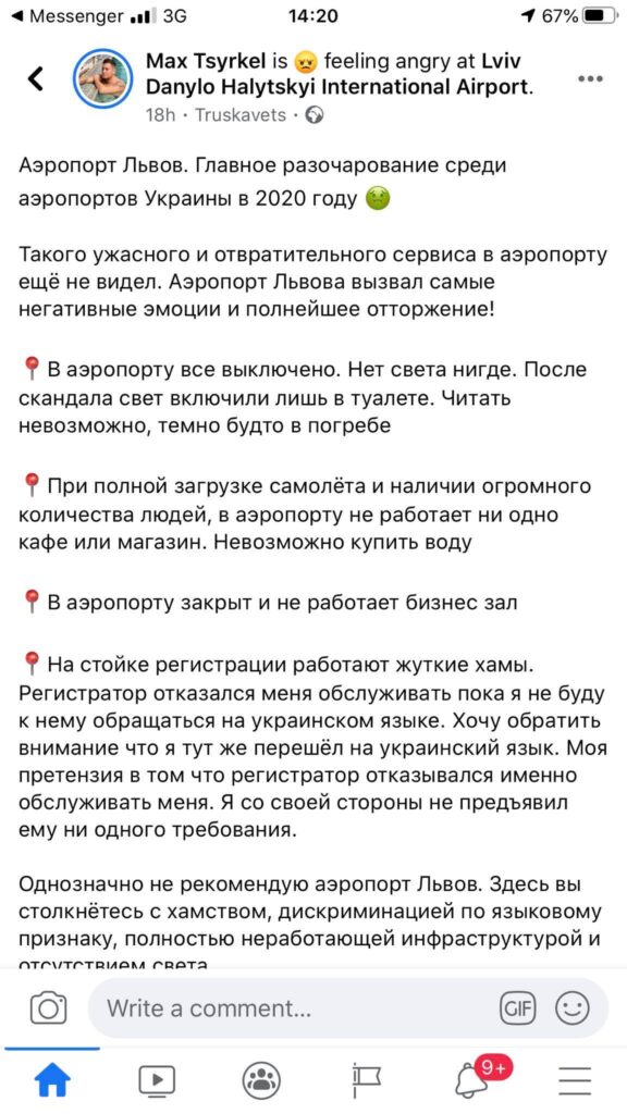 Він наголошує, що «однозначно не рекомендую аеропорт Львів. Тут ви зіткнетеся з хамством, дискримінацією за мовною ознакою, повністю непрацюючої інфраструктурою і відсутністю світла».