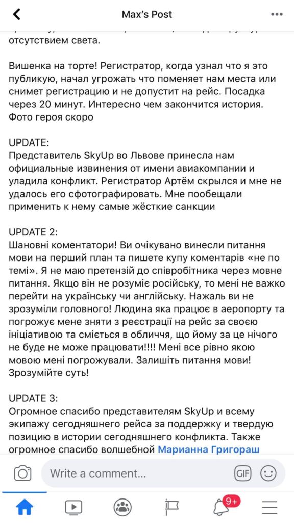 «Представник SkyUp у Львові принесла нам офіційні вибачення від імені авіакомпанії і полагодила конфлікт. Реєстратор Артем зник і мені не вдалося його сфотографувати. Мені пообіцяли застосувати до нього найжорсткіші санкції», – пише Циркель.