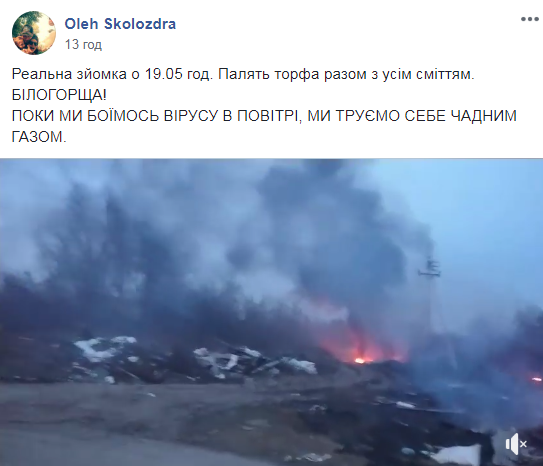 Реальна зйомка о 19.05 год. Палять торфа разом з усім сміттям. БІЛОГОРЩА!ПОКИ МИ БОЇМОСЬ ВІРУСУ В ПОВІТРІ, МИ ТРУЄМО СЕБЕ ЧАДНИМ ГАЗОМ.