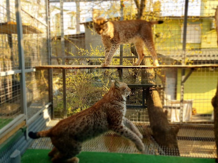 «Усі тварини, які у мене є, вони народжені в неволі, вигодувані з пляшечки, у них вже є «домашні гени». Гібриди – само собою, це штучно виведена порода, їх навіть у природі нема. Усі вони приручені, я спокійно заходжу в вольєр. Також до мене часто заходять відвідувачі, мами з діточками. Усі тварини є ручними. Самець рисі, ми його купували в Чехії, але привезли з німецького зоопарку, а дівчинка – взагалі з Словенії», — розповідає Лія Левицька.