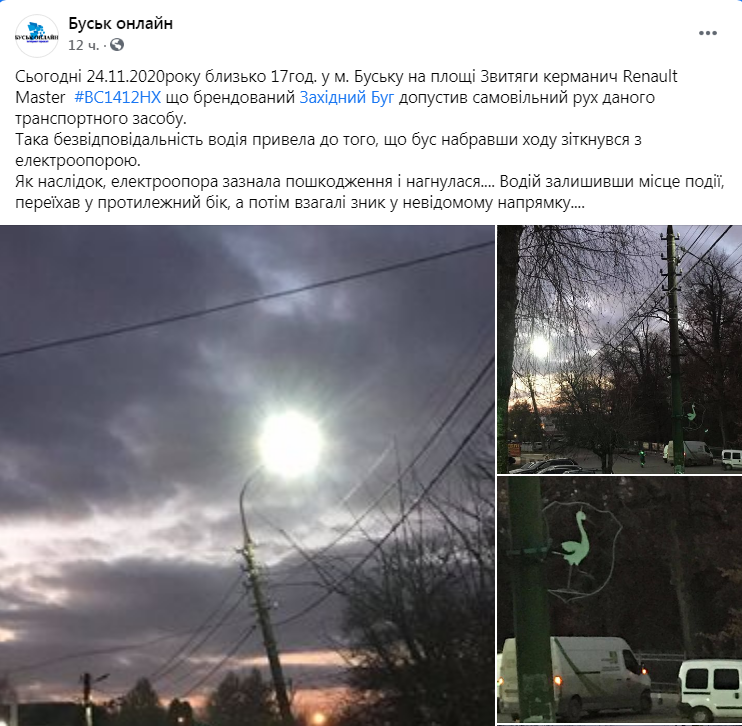 У райцентрі Буськ 24 листопада, близько 17.00, на площі Звитяги керманич Renault Master (BC 1412 HX), що брендований “Західний Буг”, допустив самовільний рух даного транспортного засобу. Така безвідповідальність водія привела до того, що бус набравши ходу зіткнувся з електроопорою.