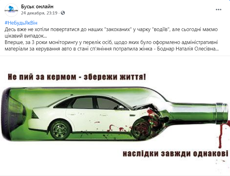 «Маємо цікавий випадок… Вперше, за 3 роки моніторингу у перелік осіб, щодо яких було оформлено адміністративні матеріали за керування авто в стані сп’яніння потрапила жінка – Боднар Наталія Олесівна…», – зазначається у повідомленні.