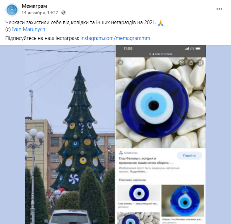 Головну ялинку Черкас прикрасили амулетами «куряче око» або «око Сатани», які начебто «захищають від вроків», а на верхівку встановлять двадцятикінечну зірку.