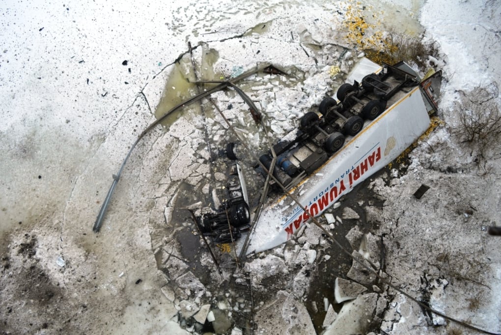 21 лютого на автомобільній дорозі М-01 “Київ-Чернігів-Нові Яриловичі” біля с. Шестовиця, Чернігівського району, вантажний автомобіль з причепом Mercedes-Benz Actros, зруйнувавши конструктивні елементи огорожі мосту та відбійника, впав з майже 20-метрової висоти у річку Десна і частково затонув.