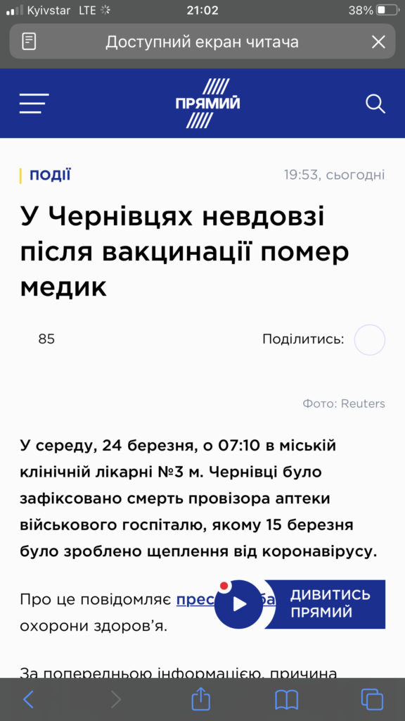 У середу, 24 березня, о 07:10 в міській клінічній лікарні №3 м. Чернівці було зафіксовано смерть провізора аптеки військового госпіталю, якому 15 березня було зроблено щеплення від коронавірусу.