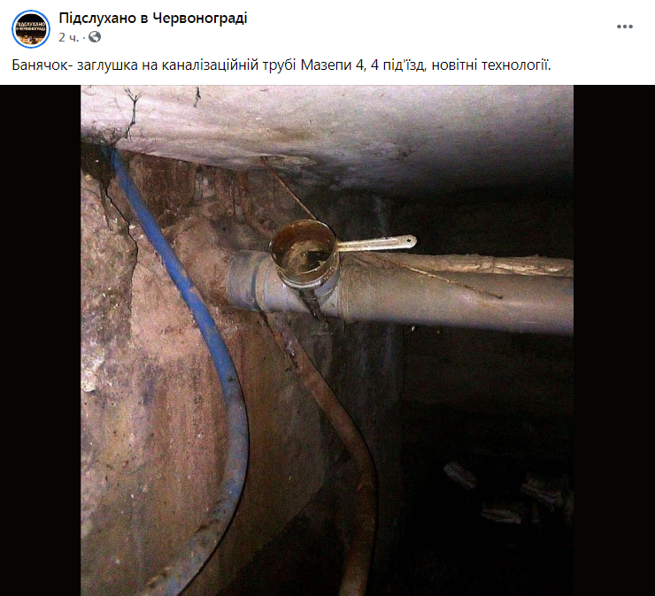 «Банячок – заглушка на каналізаційній трубі Мазепи 4, 4-й під’їзд, новітні технології», – зазначається у коментарі до світлини.