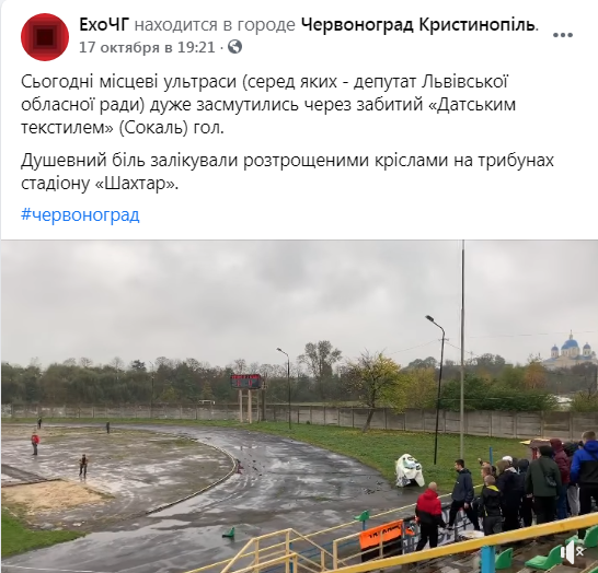 Сьогодні місцеві ультраси (серед яких – депутат Львівської обласної ради) дуже засмутились через забитий «Датським текстилем» (Сокаль) гол.Душевний біль залікували розтрощеними кріслами на трибунах стадіону «Шахтар».#червоноград