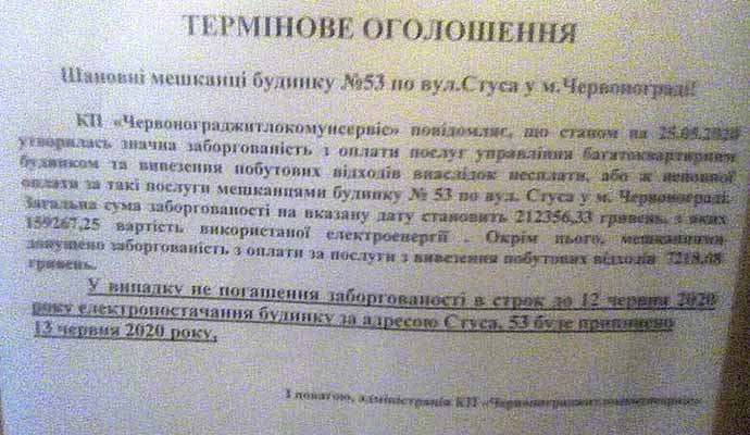Як пише «Четверта студія» з посиланням на «Над Бугом», підставою для відключення від електропостачання побутового споживача є заборгованість за оплату спожитої електроенергії. Споживача повідомляють не пізніше, ніж за 10 робочих днів до дня відключення. Але, у Червонограді “Червонограджитлокомунсервіс” вирішив не заморочуватися і вимикати світло не тим споживачам у кого борг, а відразу цілому будинку.