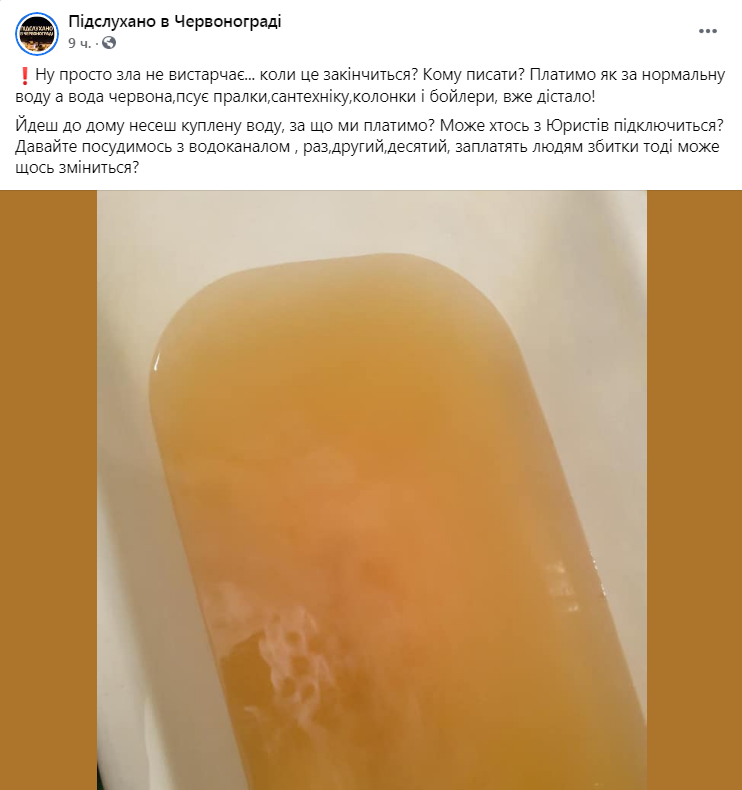 «Зла не вистачає. Коли це закінчиться? Кому писати? Платимо, як за нормальну воду, а вода червона, псує пралки, сантехніку, колонки і бойлери. Вже дістало! Йдеш до дому несеш куплену воду, за що ми платимо? Може хтось з юристів підключиться? Давайте посудимося з водоканалом, заплатять людям збитки тоді може щось зміниться?», – зазначається на сторінці спільноти «Підслухано в Червонограді» у ФБ.