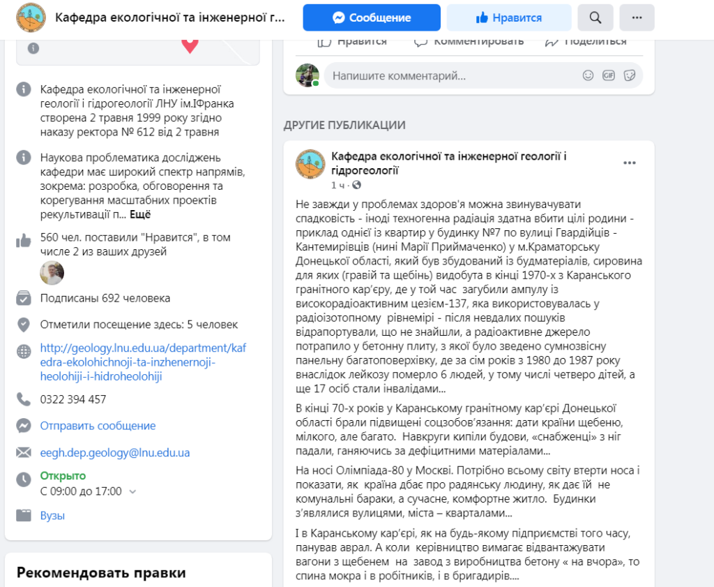 Як пише «Четверта студія», про це – у дописі на сторінці Кафедри екологічної та інженерної геології і гідрогеології ЛНУ ім. І.Франка у ФБ.