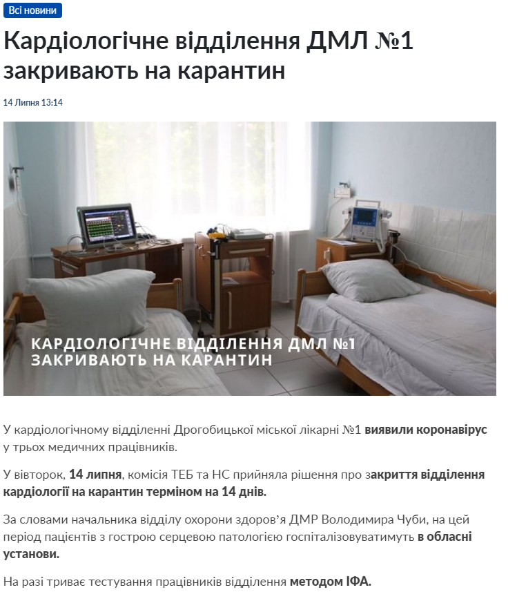 Як зазначається, сьогодні, 14 липня, комісія ТЕБ та НС прийняла рішення про закриття відділення кардіології на карантин терміном на 14 днів.