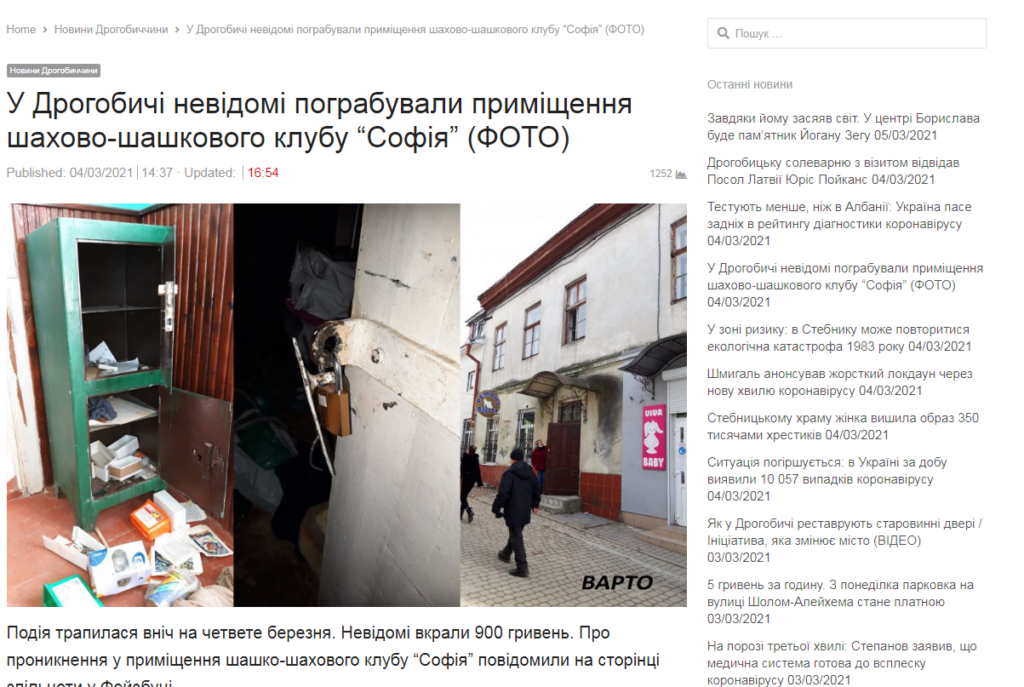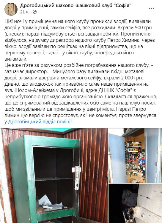 Як пише «Четверта студія» з посиланням на «ВАРТО», про проникнення у приміщення шашко-шахового клубу “Софія” повідомили на сторінці спільноти у Фейсбуці.
