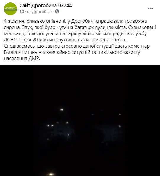 «4 жовтня, близько опівночі, у Дрогобичі спрацювала тривожна сирена. Звук, якої було чути на багатьох вулицях міста. Схвильовані мешканці телефонували на гарячу лінію міської ради та службу ДСНС. Після 20 хвилин звукової атаки – сирена стихла. Сподіваємось, що завтра стосовно даної ситуації дасть коментар Відділ з питань надзвичайних ситуацій та цивільного захисту населення ДМР»,- повідомляється на сторінці Сайт Дрогобича 03244 у ФБ.