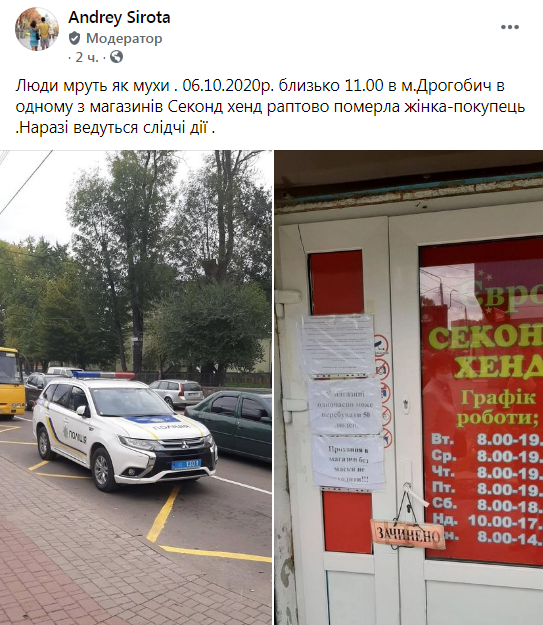 «06.10.2020 р., близько 11.00, в м.Дрогобич в одному з магазинів «Секонд-хенд» раптово померла жінка-покупець. Наразі ведуться слідчі дії», – повідомив Andrey Sirota на сторінці спільноти «Дрогобич CITY» у ФБ.
