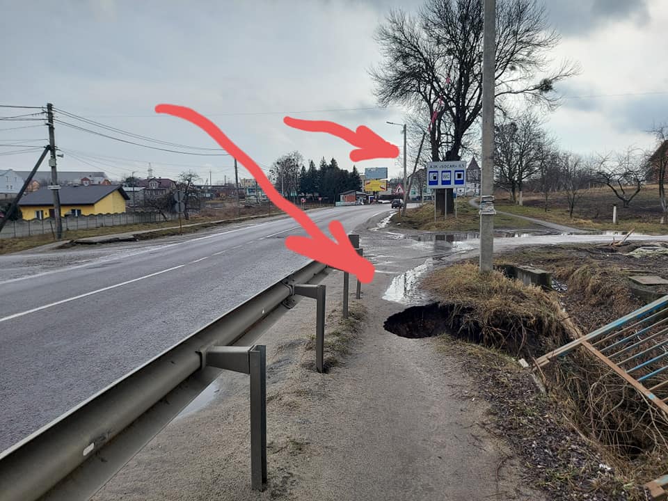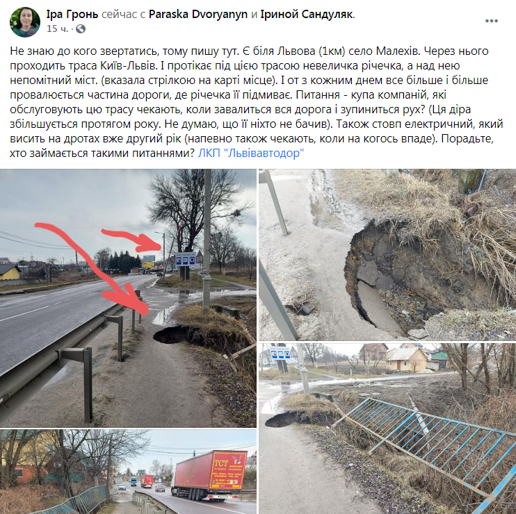 «Є біля Львова (1км) село Малехів. Через нього проходить траса Київ-Львів. І протікає під цією трасою невеличка річечка, а над нею непомітний міст. І от з кожним днем все більше і більше провалюється частина дороги, де річечка її підмиває. Питання – купа компаній, які обслуговують цю трасу чекають, коли завалиться вся дорога і зупиниться рух? Ця діра збільшується протягом року. Не думаю, що її ніхто не бачив. Також стовп електричний, який висить на дротах вже другий рік (напевно також чекають, коли на когось впаде)»,- зазначає у дописі Іра Гронь.