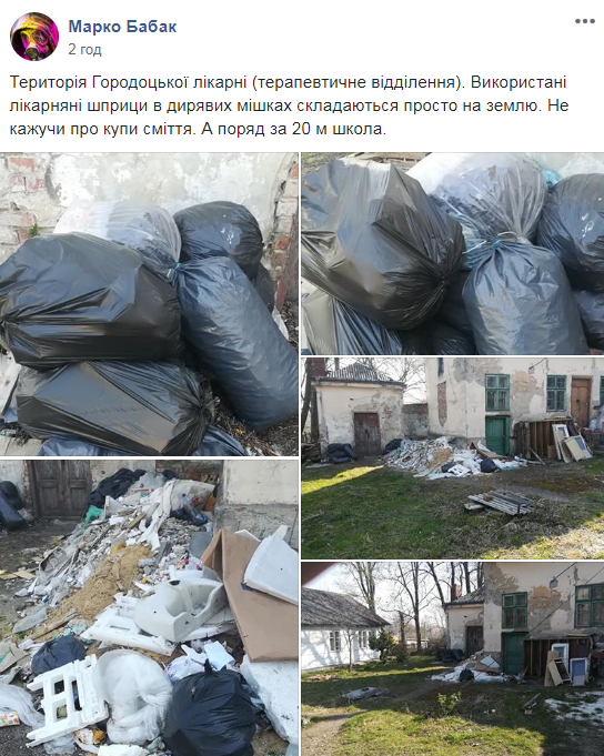«Територія Городоцької лікарні (терапевтичне відділення). Використані лікарняні шприци в дірявих мішках складаються просто на землю. Не кажучи про купи сміття. А поряд за 20 м школа»,- зазначається у дописі під світлинами з місця події.