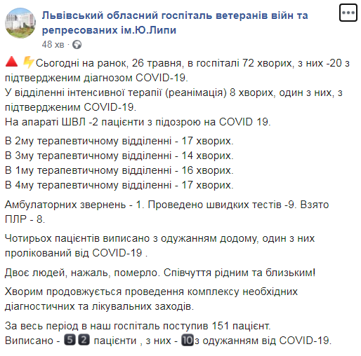 Сьогодні на ранок, 26 травня, в госпіталі 72 хворих, з них – 20 з підтвердженим діагнозом COVID-19.