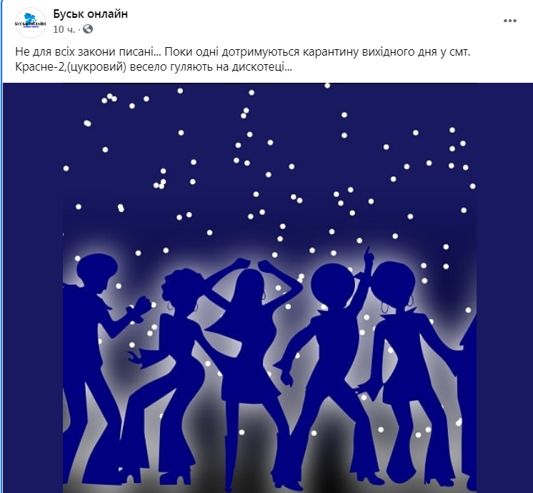 «Не для всіх закони писані. Поки одні дотримуються карантину вихідного дня у смт. Красне-2, (цукровий) весело гуляють на дискотеці…»,- зазначається у повідомленні.