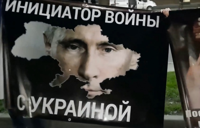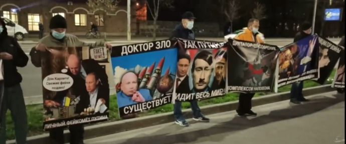 На акції активісти тримали плакати з зображенням Путіна у ролі Гітлера та Кім Чен Ина, а також з надписами “Северокореїзація Росії”, “Доктор зло існує”, “Диктатор-шизофреник з комплексом Наполеона”, “Послання Путіна – це лапша й потік дезінформації”.